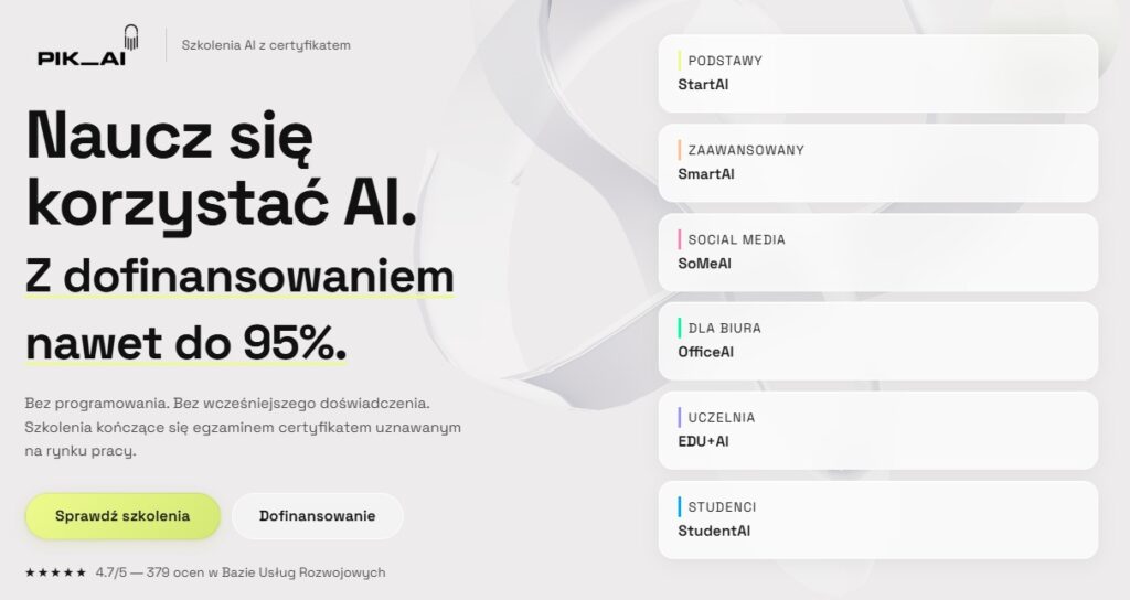 → Działania szkoleniowe i obsługę dofinansowań prowadzimy przez markę operacyjną PIK_AI – tworzoną przez Polski Instytut Kompetencji Przyszłości.